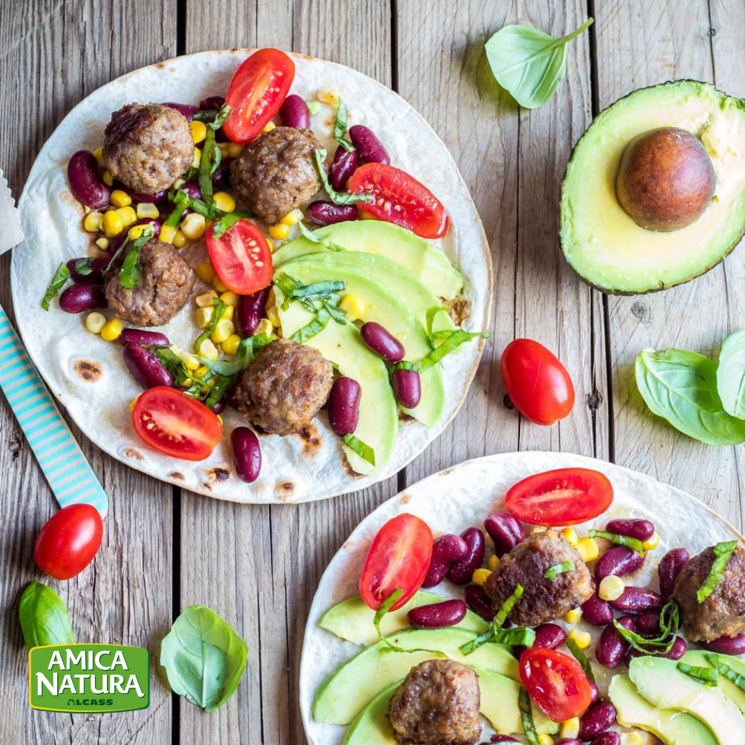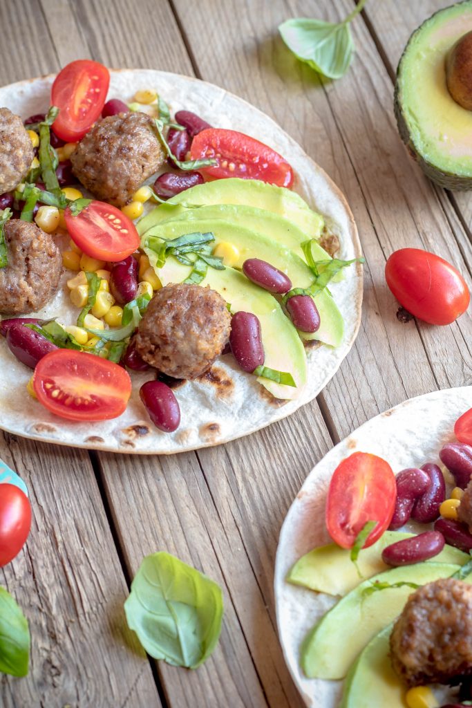 When the meatballs are ready, heat the tortillas and fill them with all the ingredients. Ultimate with fresh minced basil.