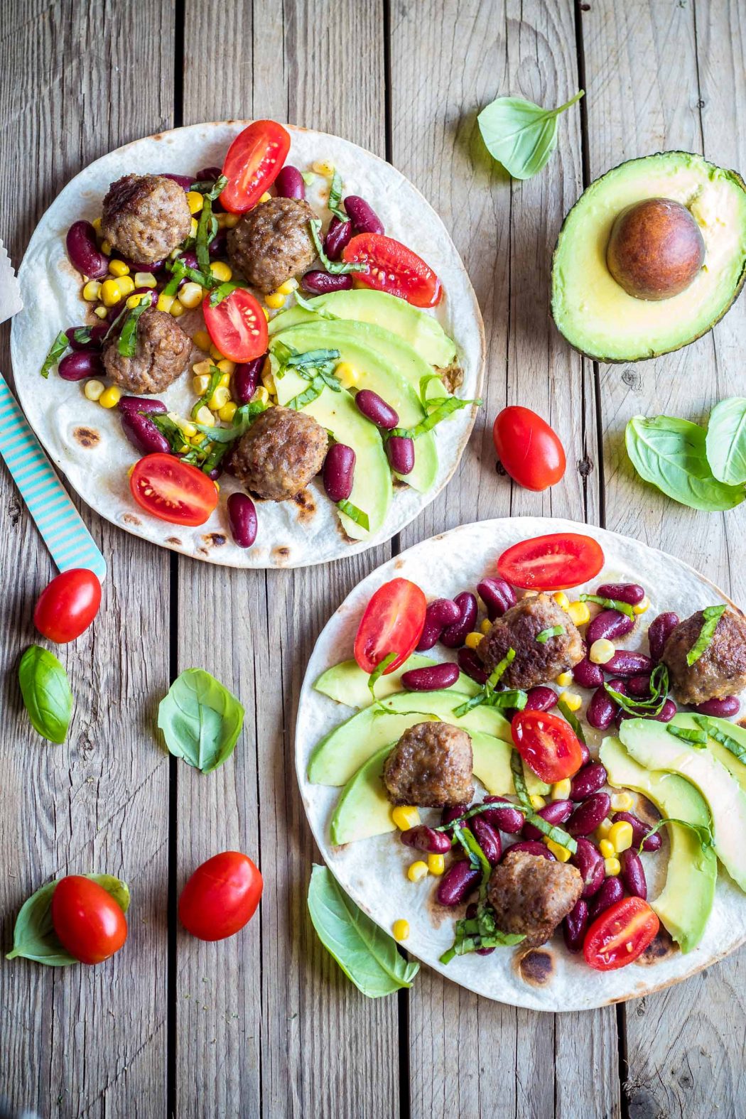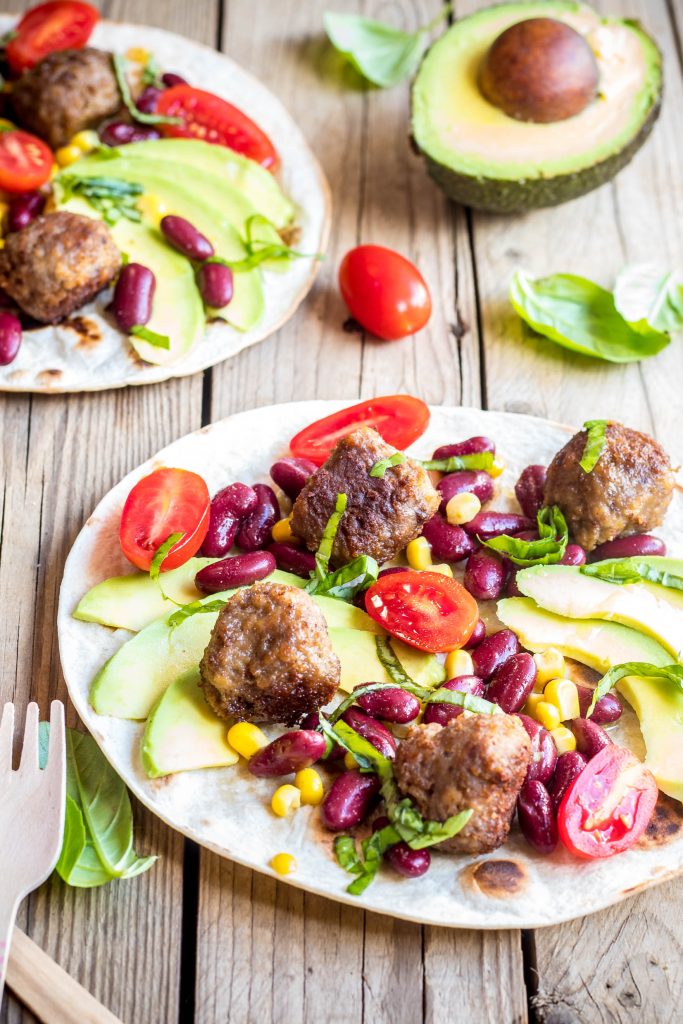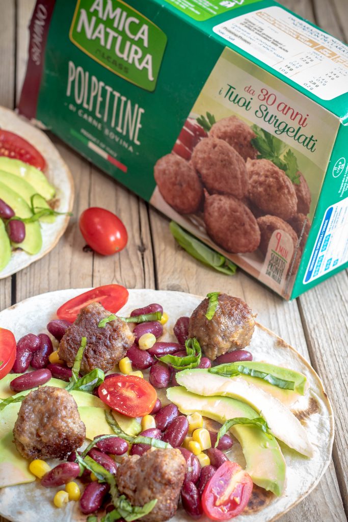 Quando le polpette saranno pronte scaldate le tortillas e farcitele con tutti gli ingredienti. Ultimate con basilico tritato fresco.